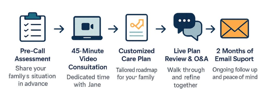 Book a game-planning consultation with Jane — a senior living expert with a 20 year track record helping seniors and their families find the best living situation.